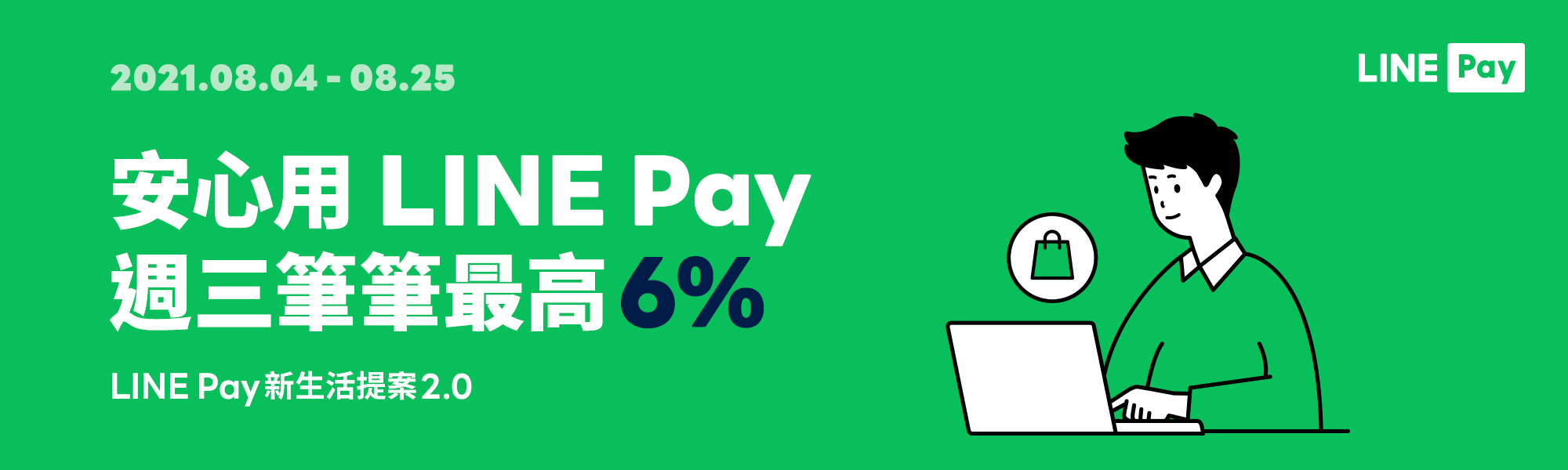 • 活動期間內每週三已註冊 LINE Pay 的用戶於指定線上購物網消費,結帳時透過 LINE Pay 使用已綁定的任一發卡銀行信用卡/簽帳金融卡或 LINE Pay Money 帳戶付款,筆筆享 LINE POINTS 6% 點數回饋