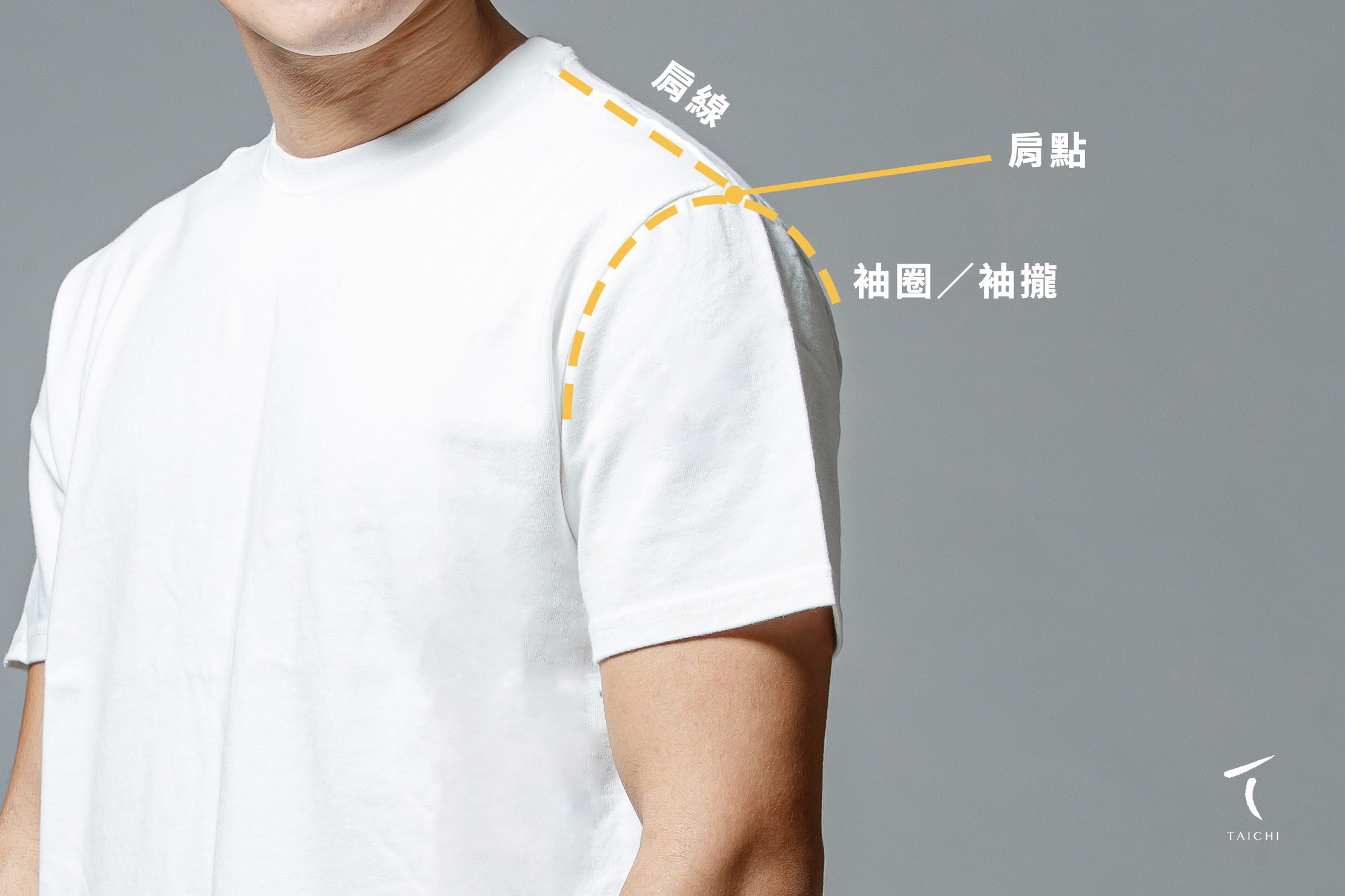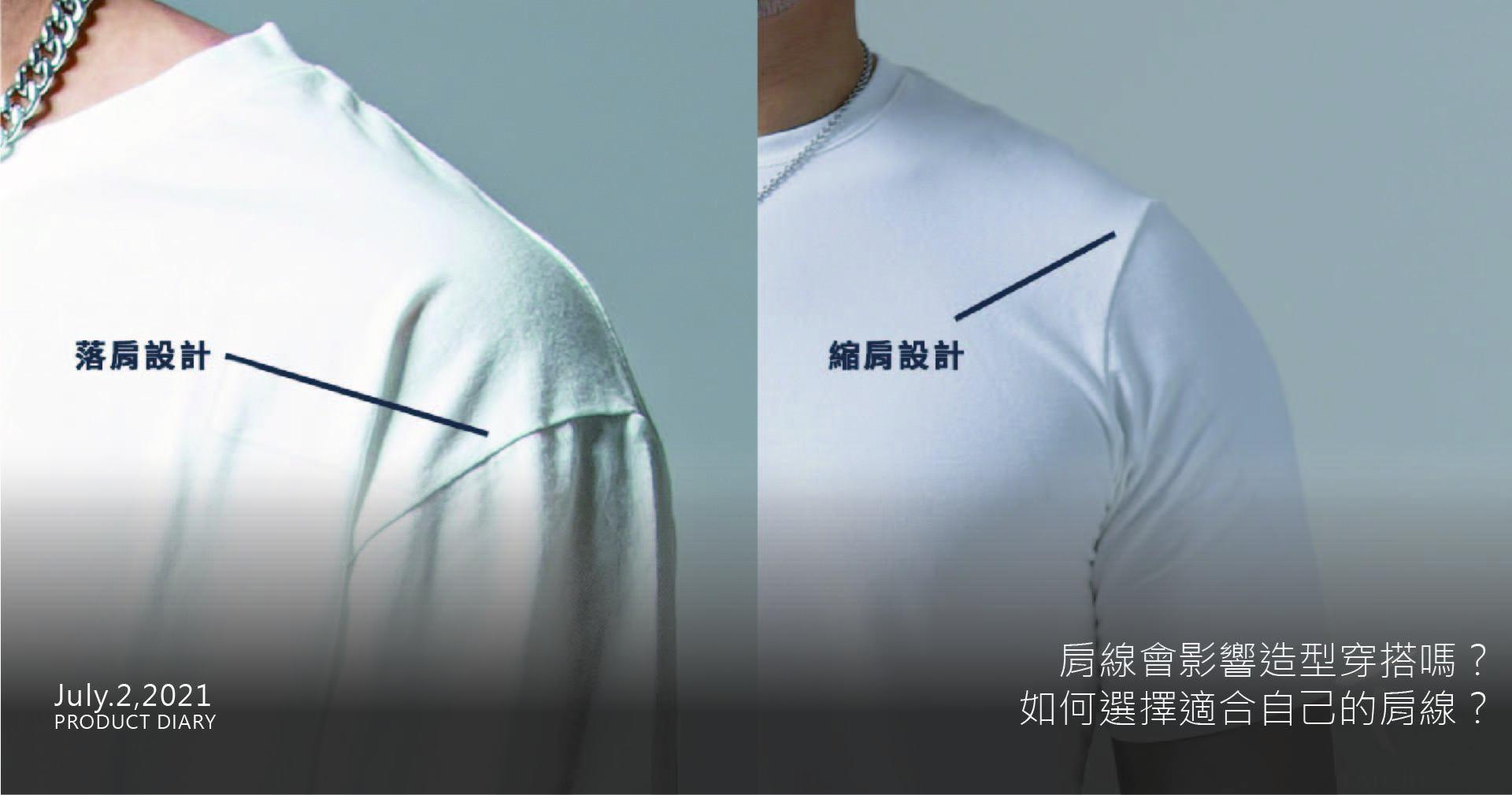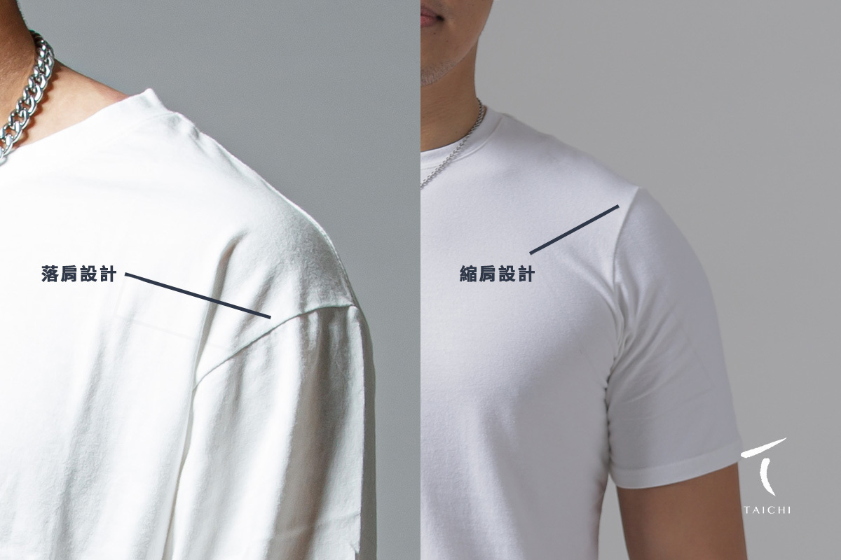 一般來說,肩線的設計有很多種,肩線可以往鎖骨跑,也可以往肩頰骨跑,那種設計可以讓背部視覺有所不同,多半用在襯衫設計,所以這邊就不多談。素T比較常見的是縮肩與落肩設計,也就是肩線的長短,導致袖圈往鎖骨靠,或是往手臂掉。
