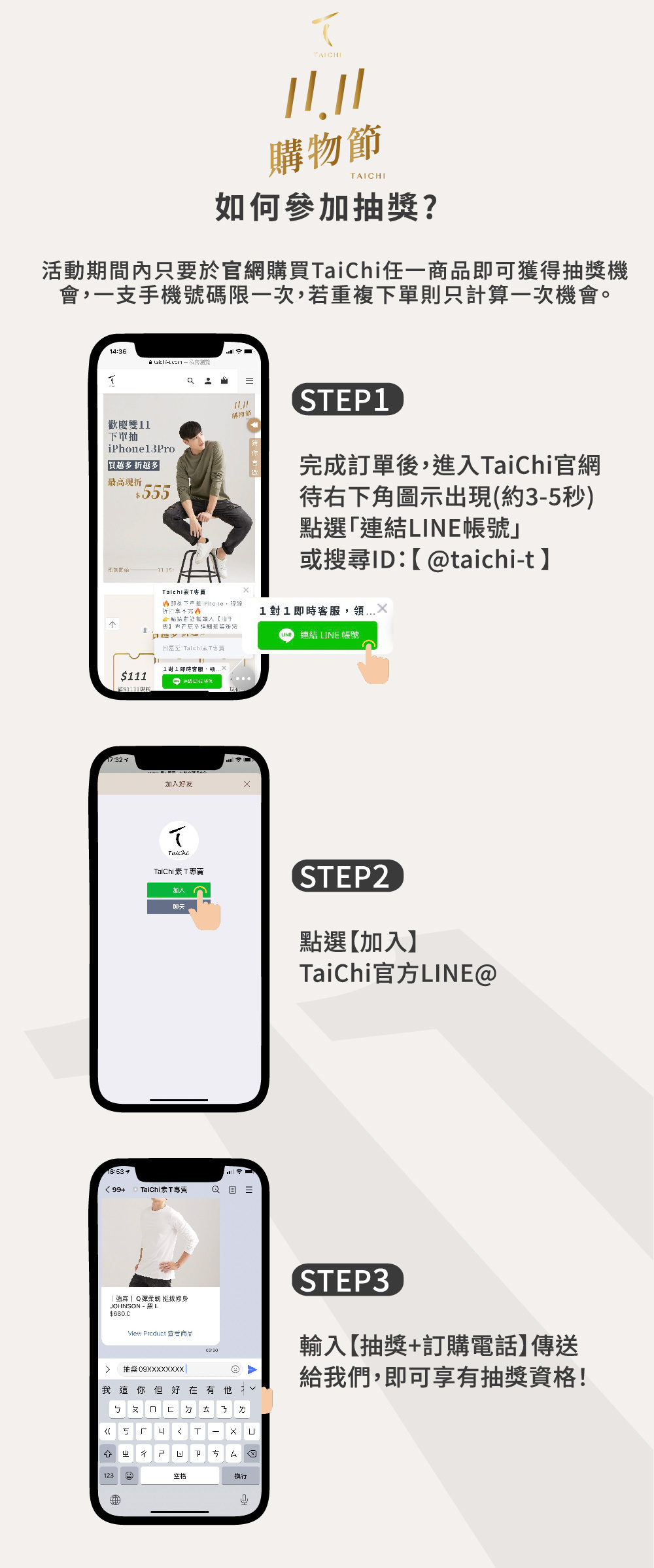 進入TaiChi官網→點選右下角「連結LINE帳號」→進入TaiChi官方LINE@→於對話框輸入【抽獎+訂購人之電話號碼】