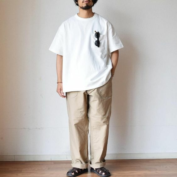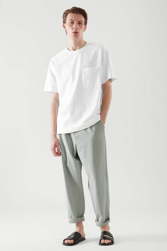 儘管捲褲管幾乎可以運用在各式穿搭上,但是上身穿口袋T,就讓這個小細節更為合理。口袋的俐落直線,若搭配線條同樣筆直的直筒褲,就能營造精明幹練、充滿朝氣的外型。