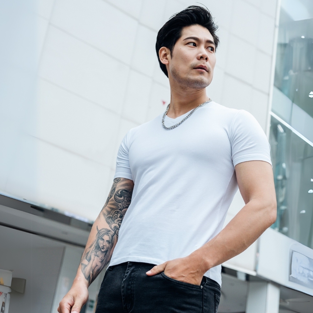 肩寬與袖口收窄,凸顯上身與手臂精壯肌肉